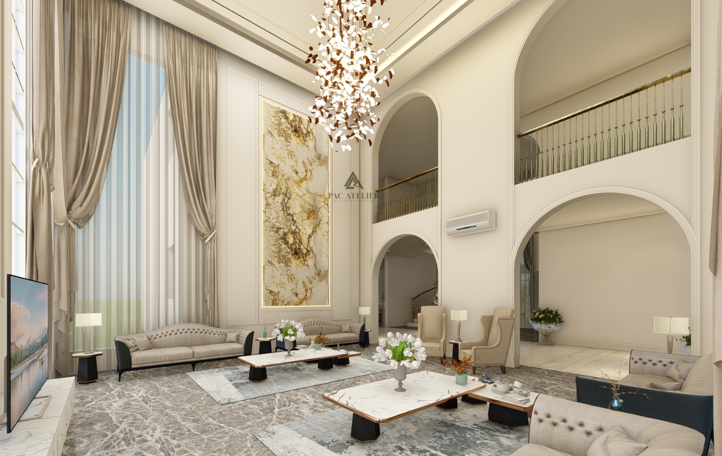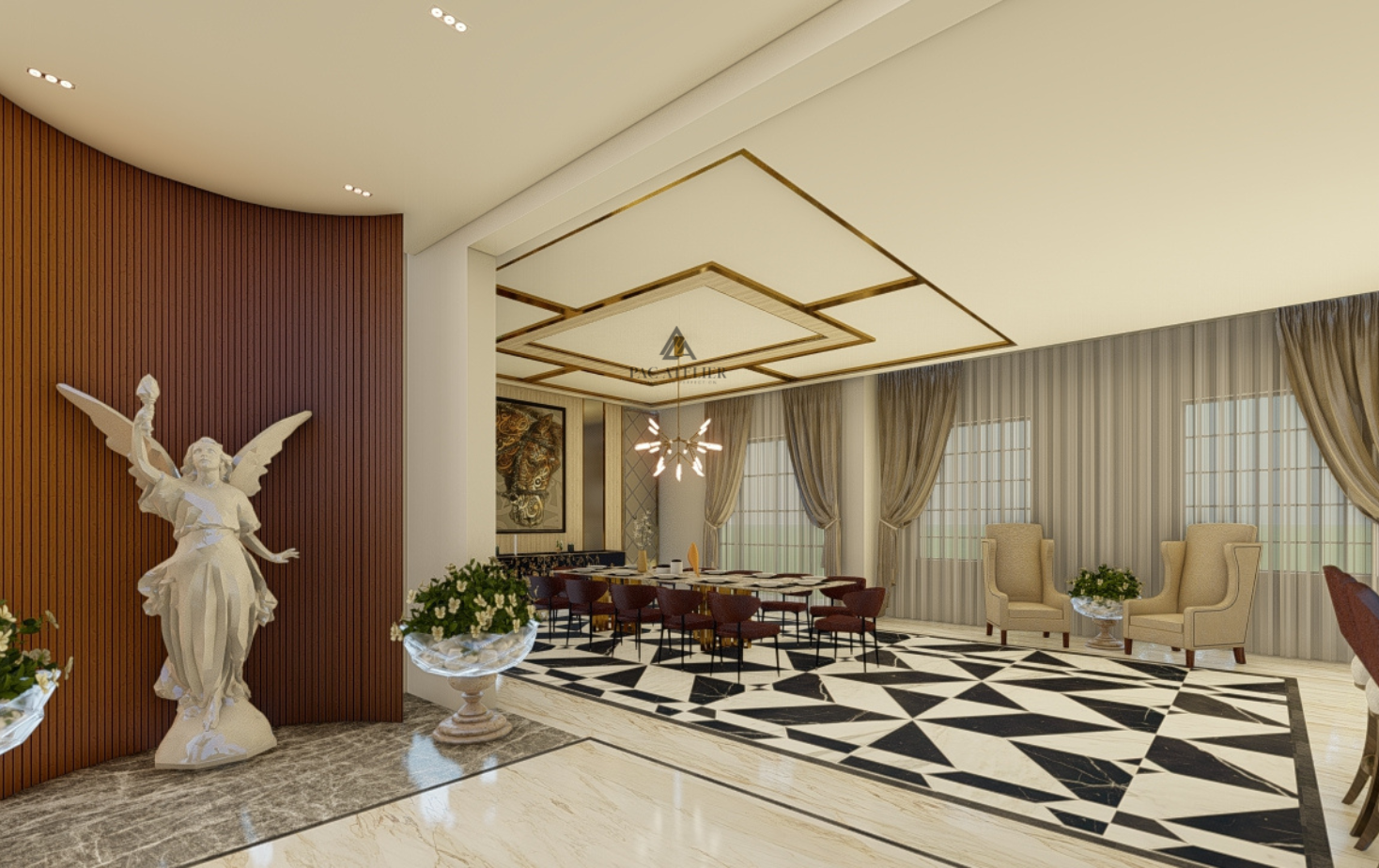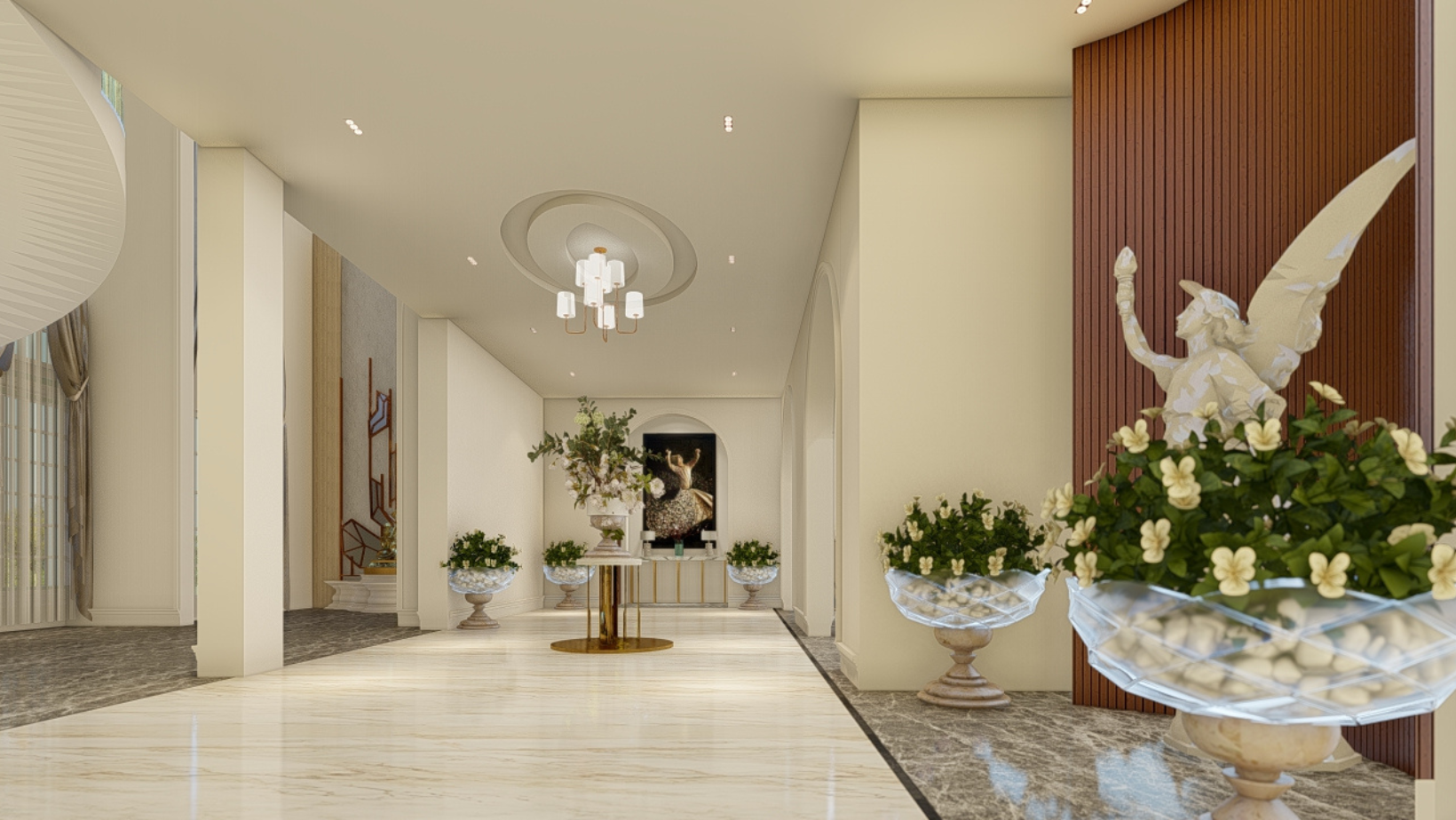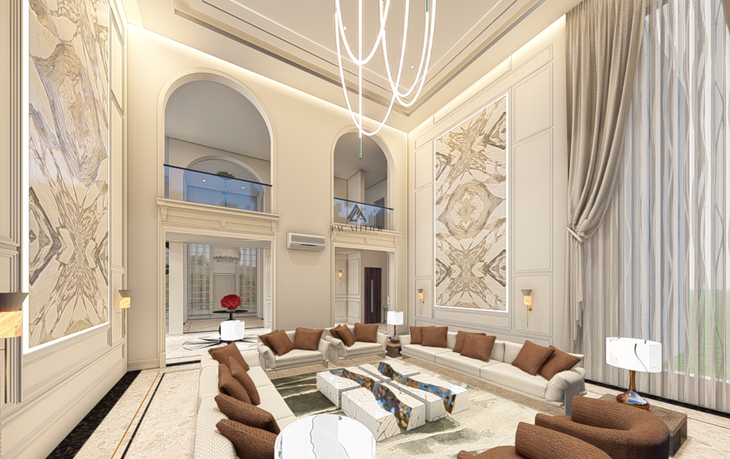 This opulent home is a celebration of classical grandeur tastefully infused with contemporary sophistication. The beautiful façade, with its symmetrical form, large arched windows, elaborate wall detailing, and soft beige tones that radiate timeless elegance, grabs attention as soon as you approach the exterior. The entry, surrounded by well-kept gardens, dim lighting, and well-placed landscape features, establishes the elegance, tranquility, and style of the interior. A large, light-filled lobby greets you as soon as you enter, echoing the elegance of palace-style architecture. The elaborate ceiling molding and modern chandeliers give a sophisticated charm, while the high ceilings and arched doors convey an air of openness and grandeur. Throughout, exquisite marble flooring adds to the opulence while keeping everything looking tidy and well-maintained. A focal point and a sign of hospitality, a centerpiece floral arrangement on a pedestal with gold accents brings warmth and vitality to the room.