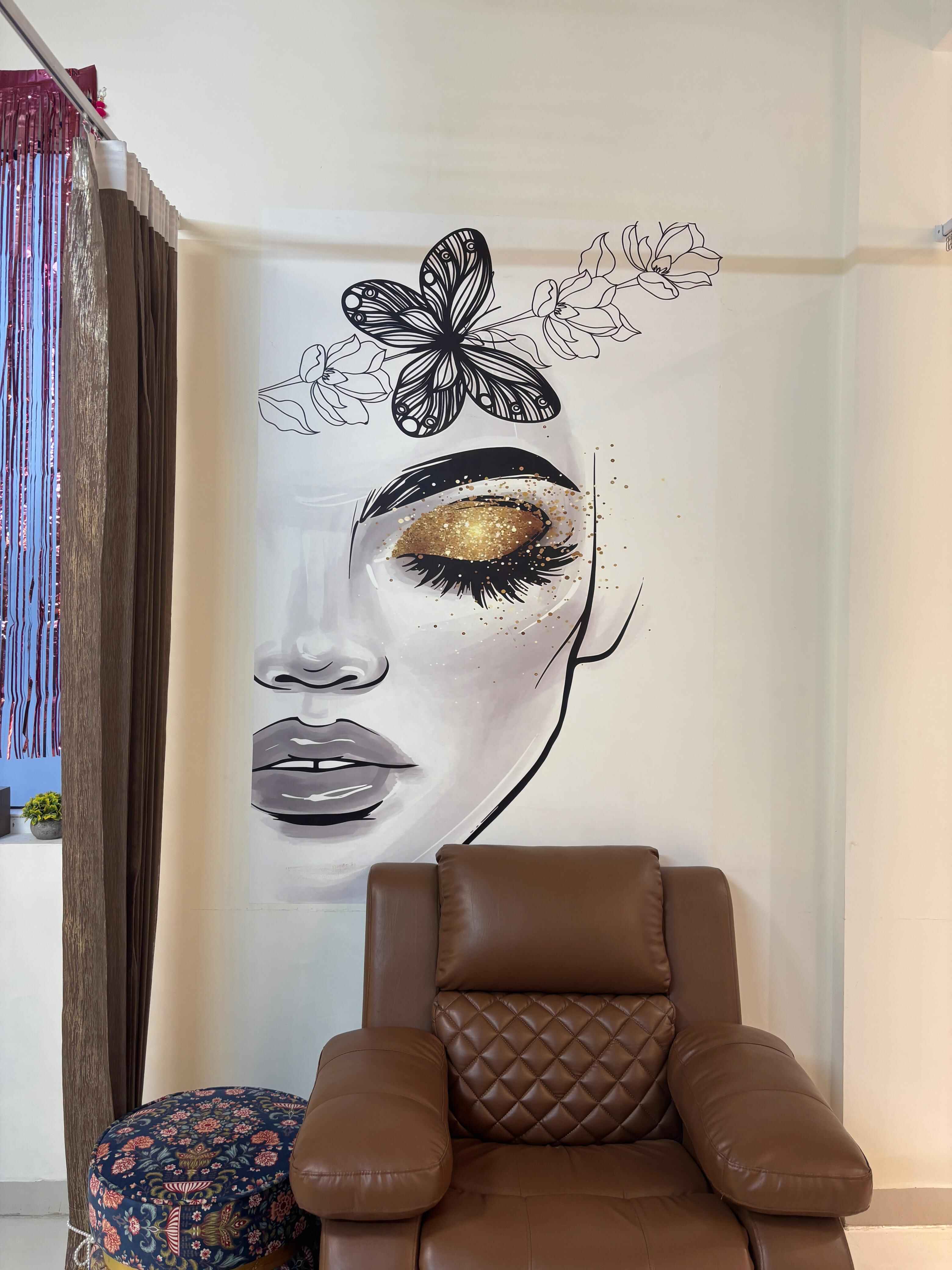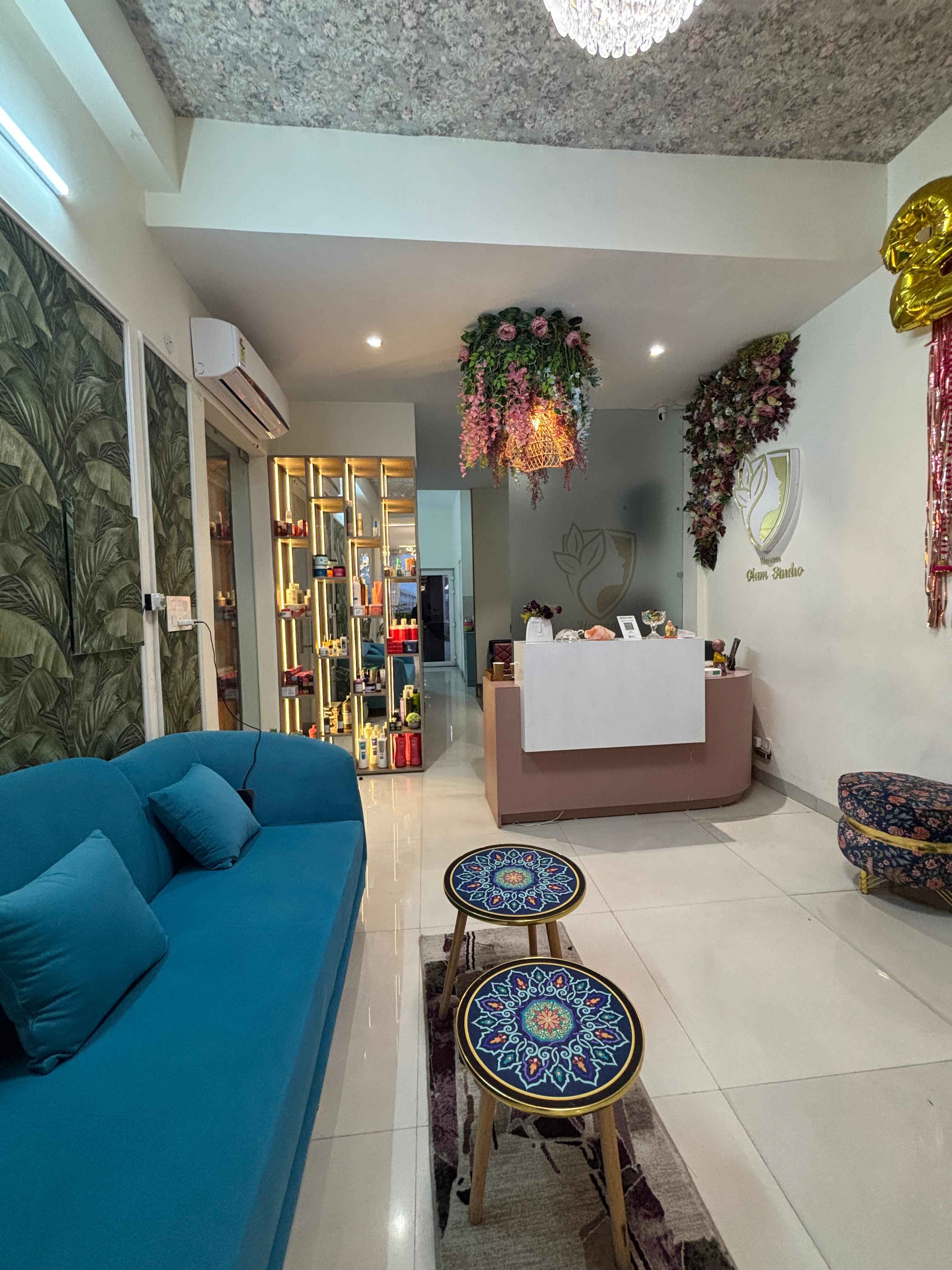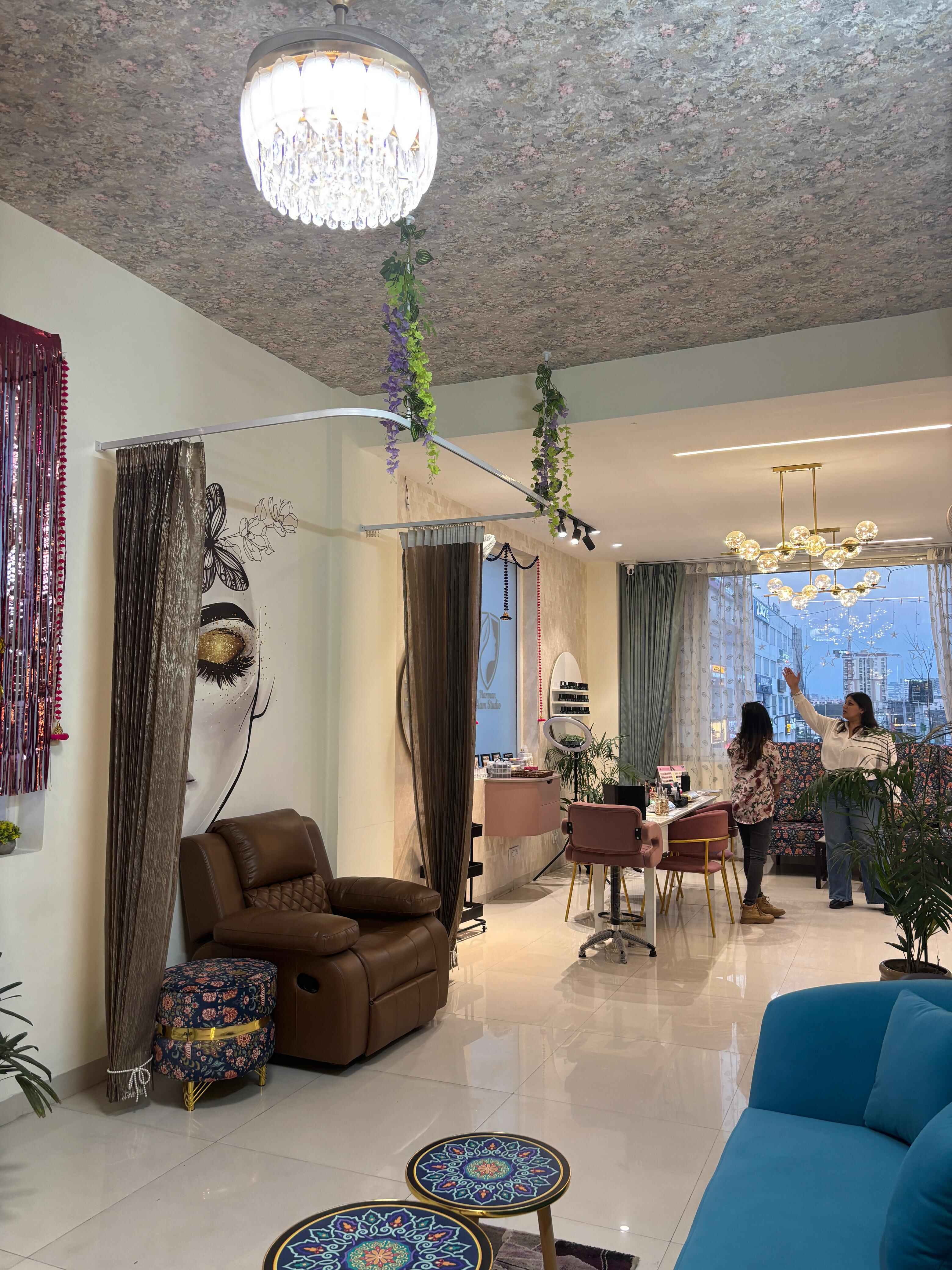 Every area of Harman Glam Studio exudes charm, attention to detail, and refinement. It is a stunning beauty destination where contemporary elegance meets opulent luxury. Clients are welcomed by a gorgeous floral ceiling installation that catches their attention right away. The warm golden cage light is encircled by cascading pink, yellow, and purple wisteria, creating an ethereal and magical atmosphere. A sleek, blush-toned reception desk with soft white panels, crystal décor, fresh floral arrangements, a salt lamp, and company brochures are all placed beneath this charming canopy, creating a welcoming yet polished atmosphere. Floral wall art that blends in well with the natural aesthetic is placed on either side of the studio’s gold-etched emblem, which has a woman’s silhouette and a leaf motif.