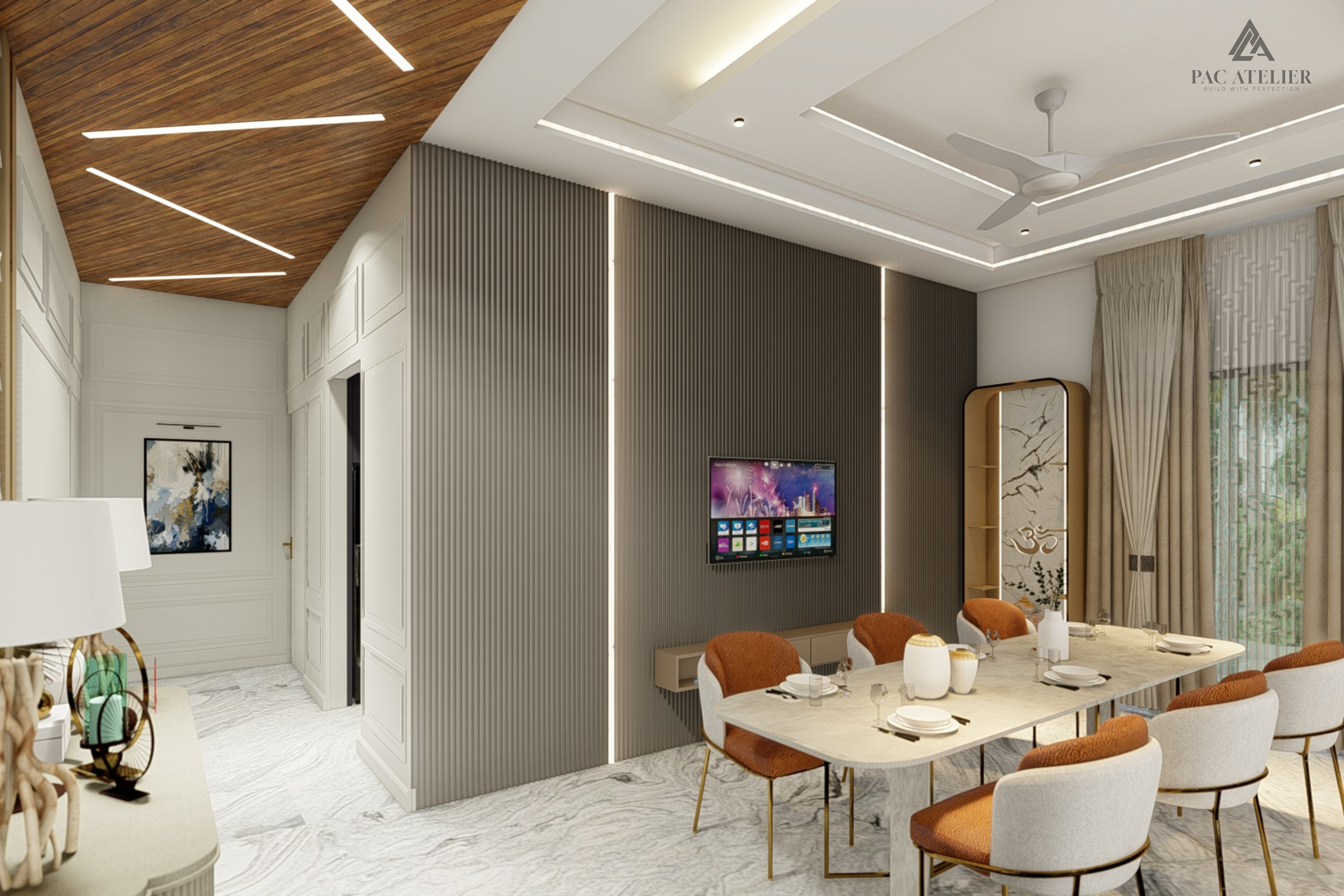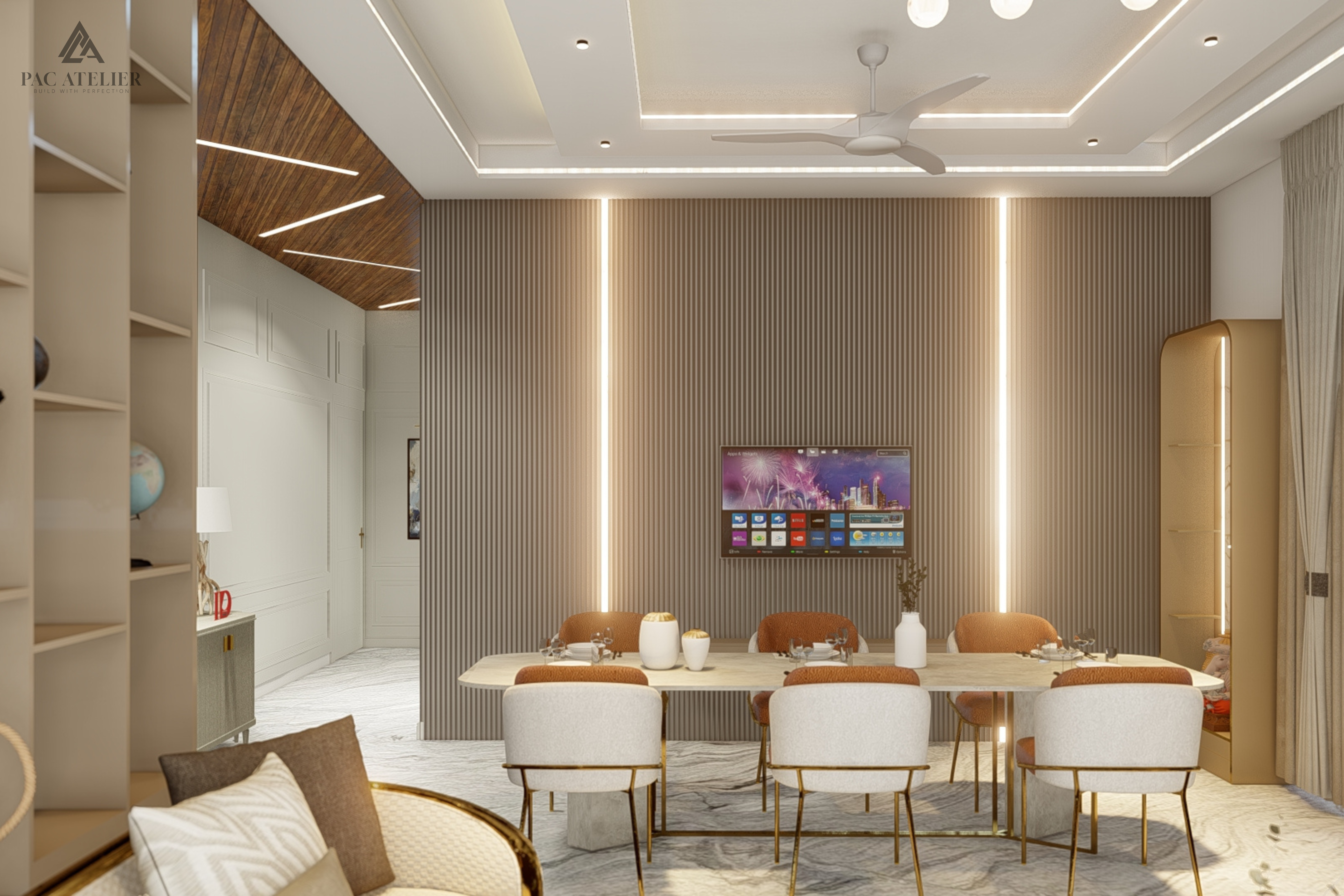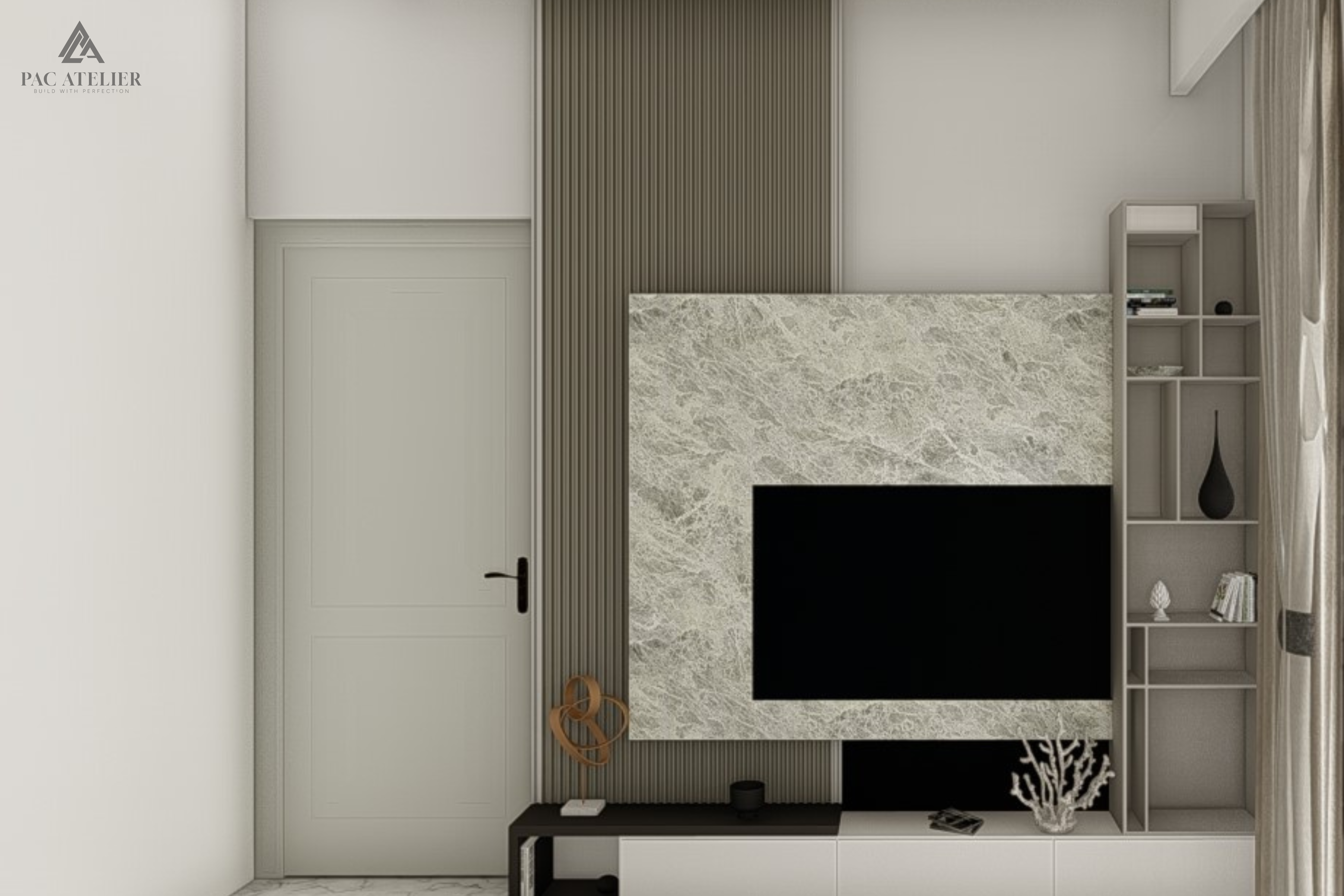The kitchen has a fantastic look with a nod to a more streamlined look for its interior. You can achieve this with matte-finished cabinetry in natural shades accompanied by a backsplash or countertops crafted from marble. You can add more functionality by including display niches while still focusing on a seamless experience with efficient spaces for maximum movement. Considerably elegant and refined is the living area with the TV unit space. Here again, a nice use of texture in choosing a combination of paneling on the walls and marble to place on top of the TV unit has resulted in a stylish look without being too dramatic in nature. Finally, a space that very well reflects PAC Atelier’s vision and notion of a home—a space combining sleek contemporary looks with material harmony and meticulous detail to create a home that is both stylishly elegant and invitingly livable.