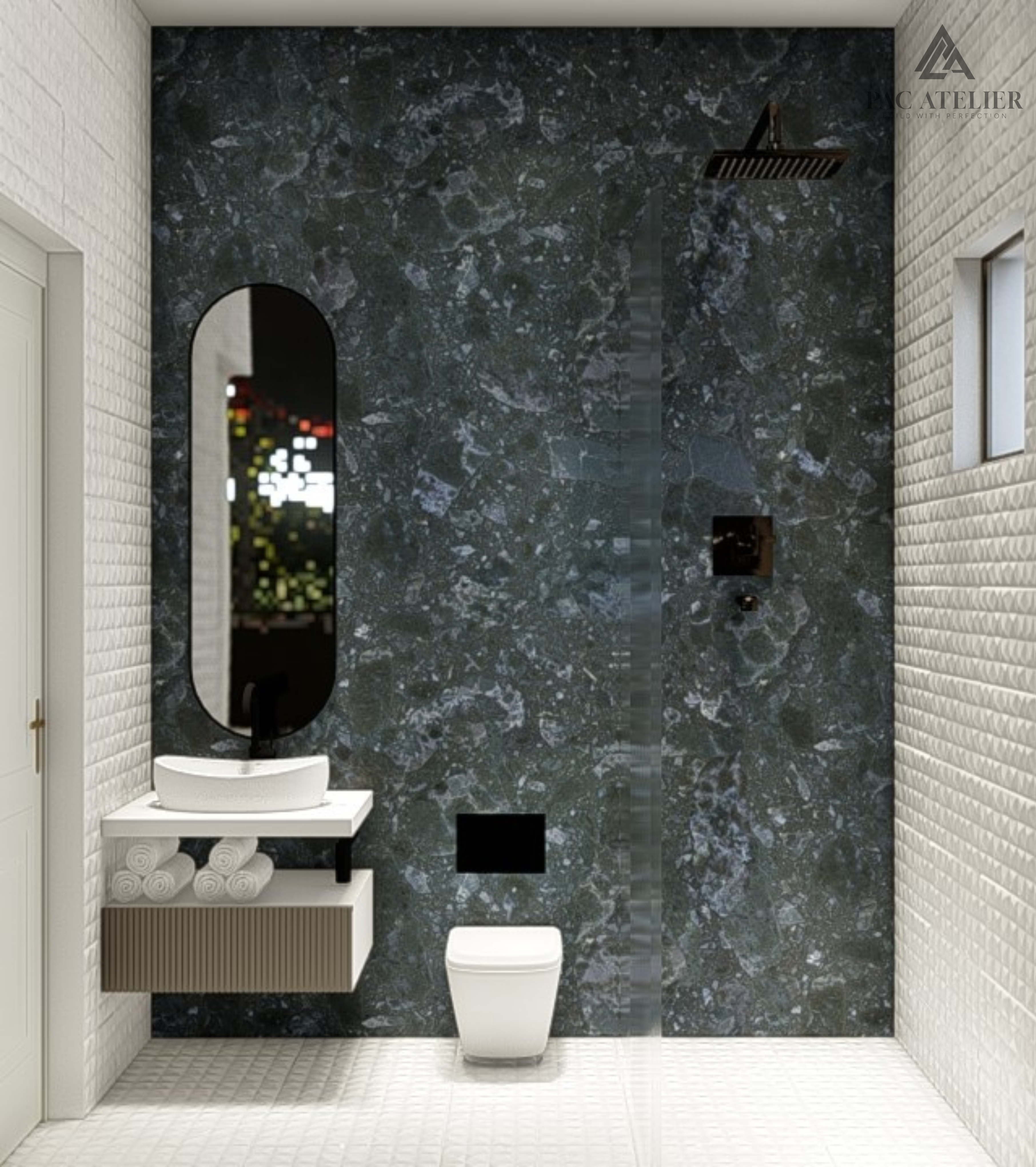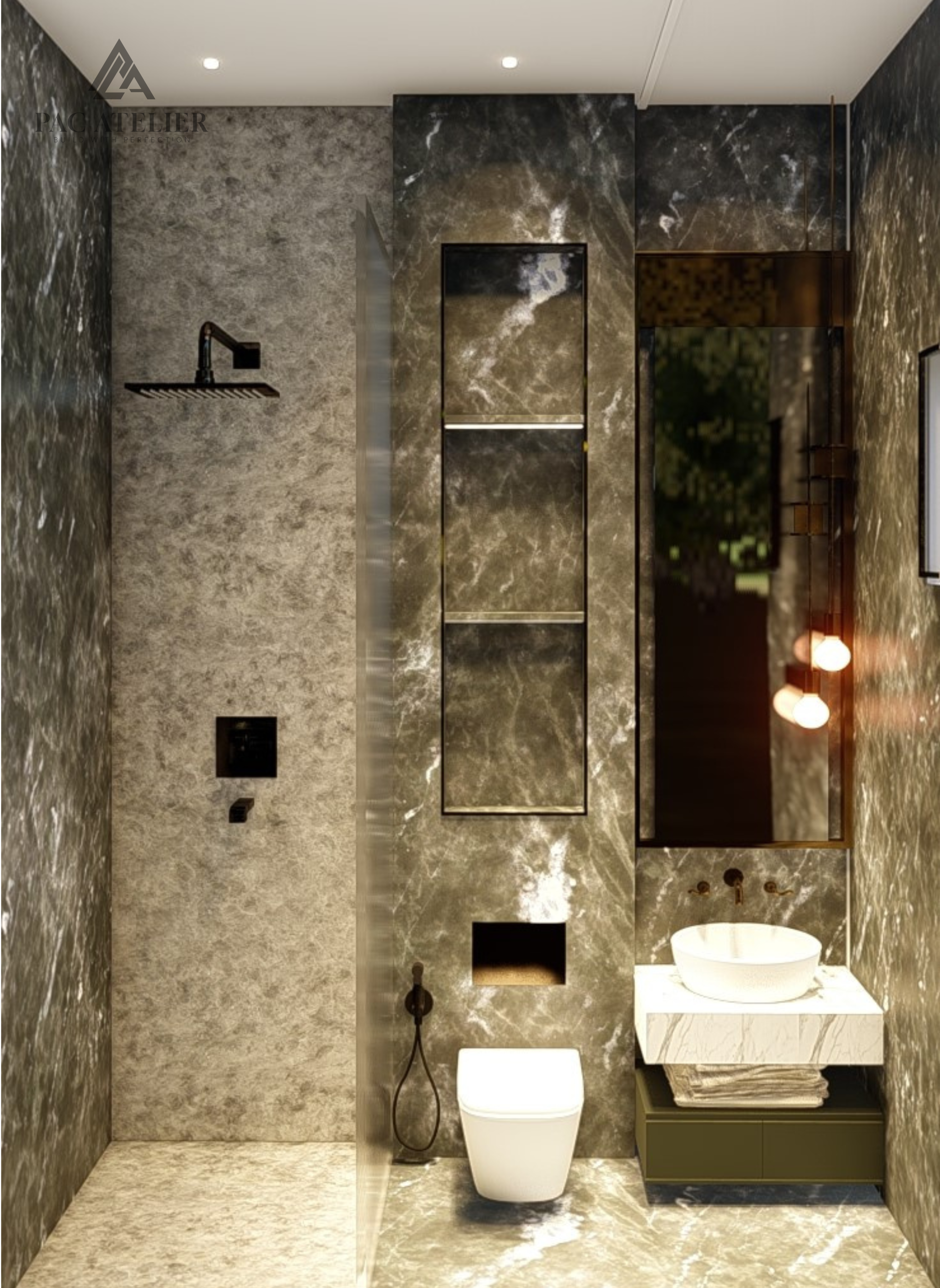 The bathroom design offers an opulent ambiance similar to a spa with full height marble finish surfaces, providing depth and continuity in the design. Use of matte black helps in providing a contrasting look and providing storage spaces through niches and a floating vanity, keeping everything clutter-free and simple with warm and soft lighting providing a soothing ambiance with stone finishes.
