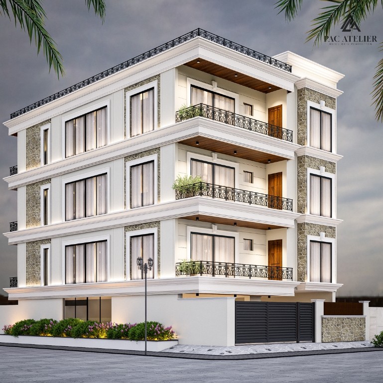 Strong horizontal lines and well-proportioned cornice bands enhance the geometry of the structure, giving it a commanding yet graceful street presence. Expansive windows ensure ample natural light and ventilation, while maintaining privacy and comfort within the interiors. The intricately designed metal railings add character to the balconies, introducing a subtle classical touch to the contemporary elevation. Warm wooden-finish soffits beneath the extended slabs bring depth and richness to the exterior palette. Carefully planned façade lighting highlights the architectural elements after sunset, enhancing the home’s premium appeal. The landscaped boundary edges further soften the structure, creating a welcoming and elegant frontage. The Stonecrest Residence stands as a thoughtfully crafted urban home—where design precision, material harmony, and architectural excellence come together to define luxury living in Panchkula.