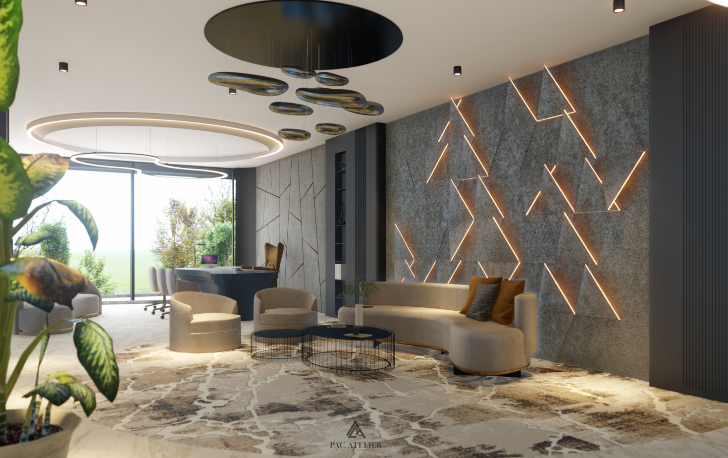 Strong horizontal lines and well-proportioned cornice bands enhance the geometry of the structure, giving it a commanding yet graceful street presence. Expansive windows ensure ample natural light and ventilation, while maintaining privacy and comfort within the interiors. The intricately designed metal railings add character to the balconies, introducing a subtle classical touch to the contemporary elevation. Warm wooden-finish soffits beneath the extended slabs bring depth and richness to the exterior palette. Carefully planned façade lighting highlights the architectural elements after sunset, enhancing the home’s premium appeal. The landscaped boundary edges further soften the structure, creating a welcoming and elegant frontage. The Stonecrest Residence stands as a thoughtfully crafted urban home—where design precision, material harmony, and architectural excellence come together to define luxury living in Panchkula.