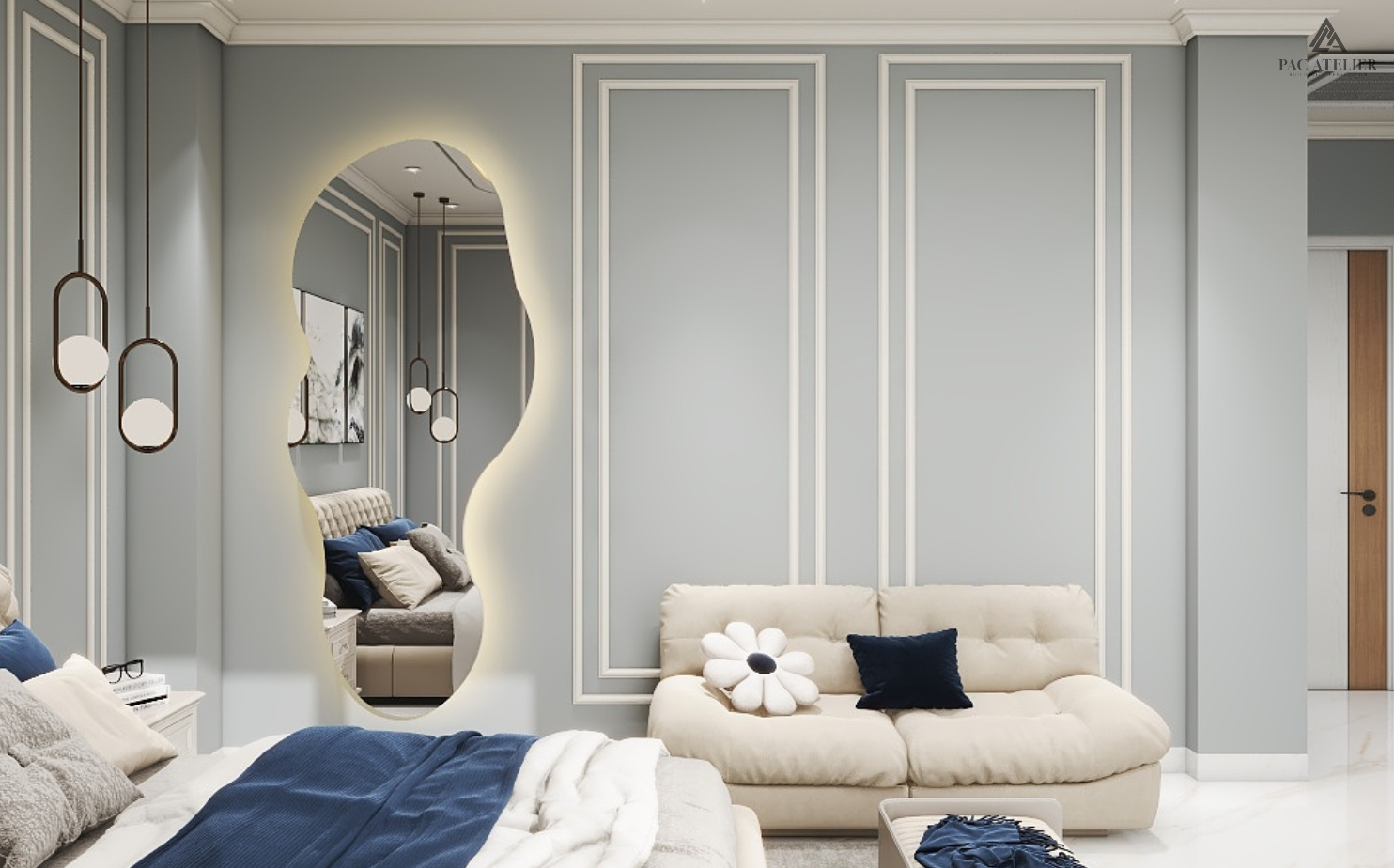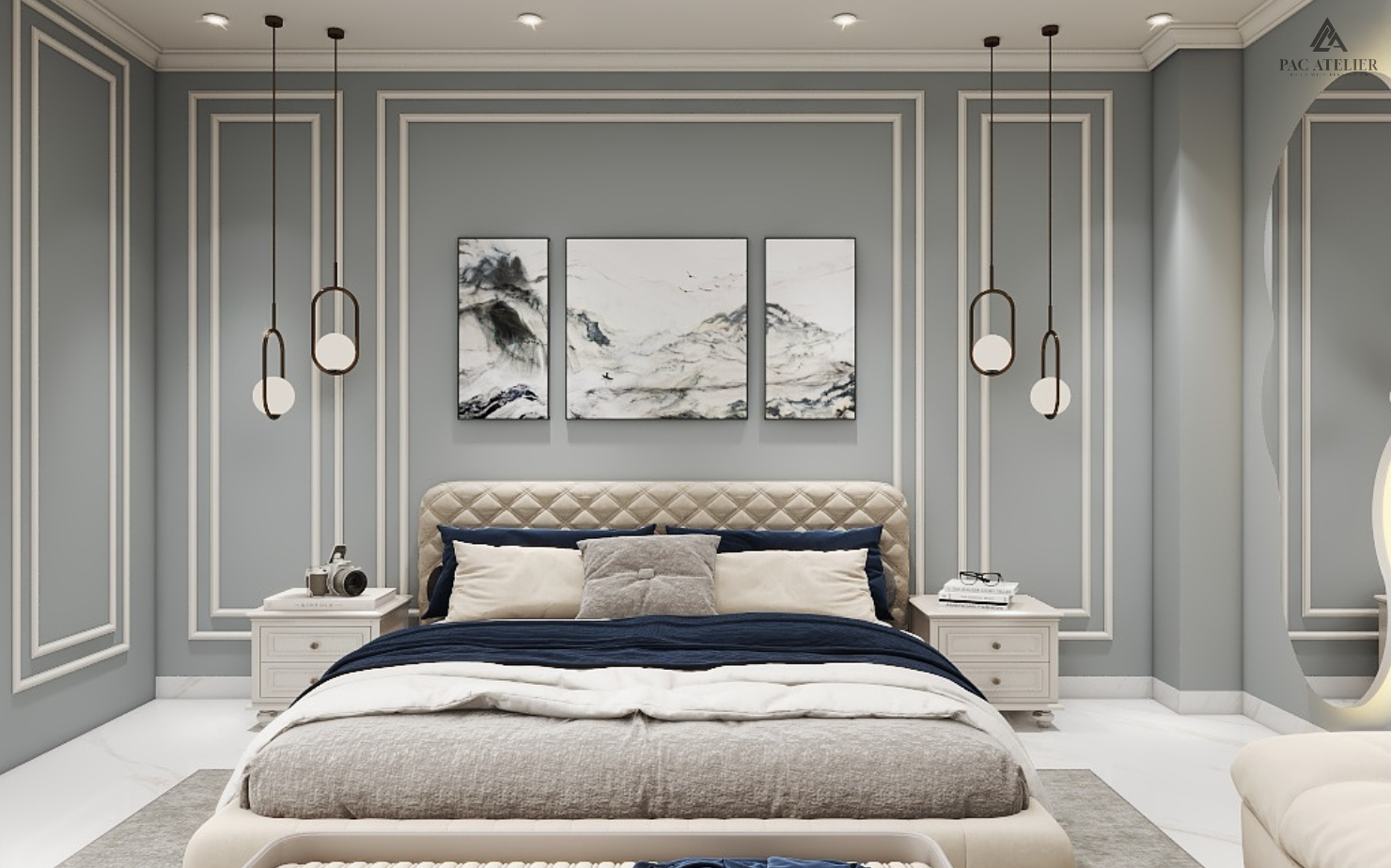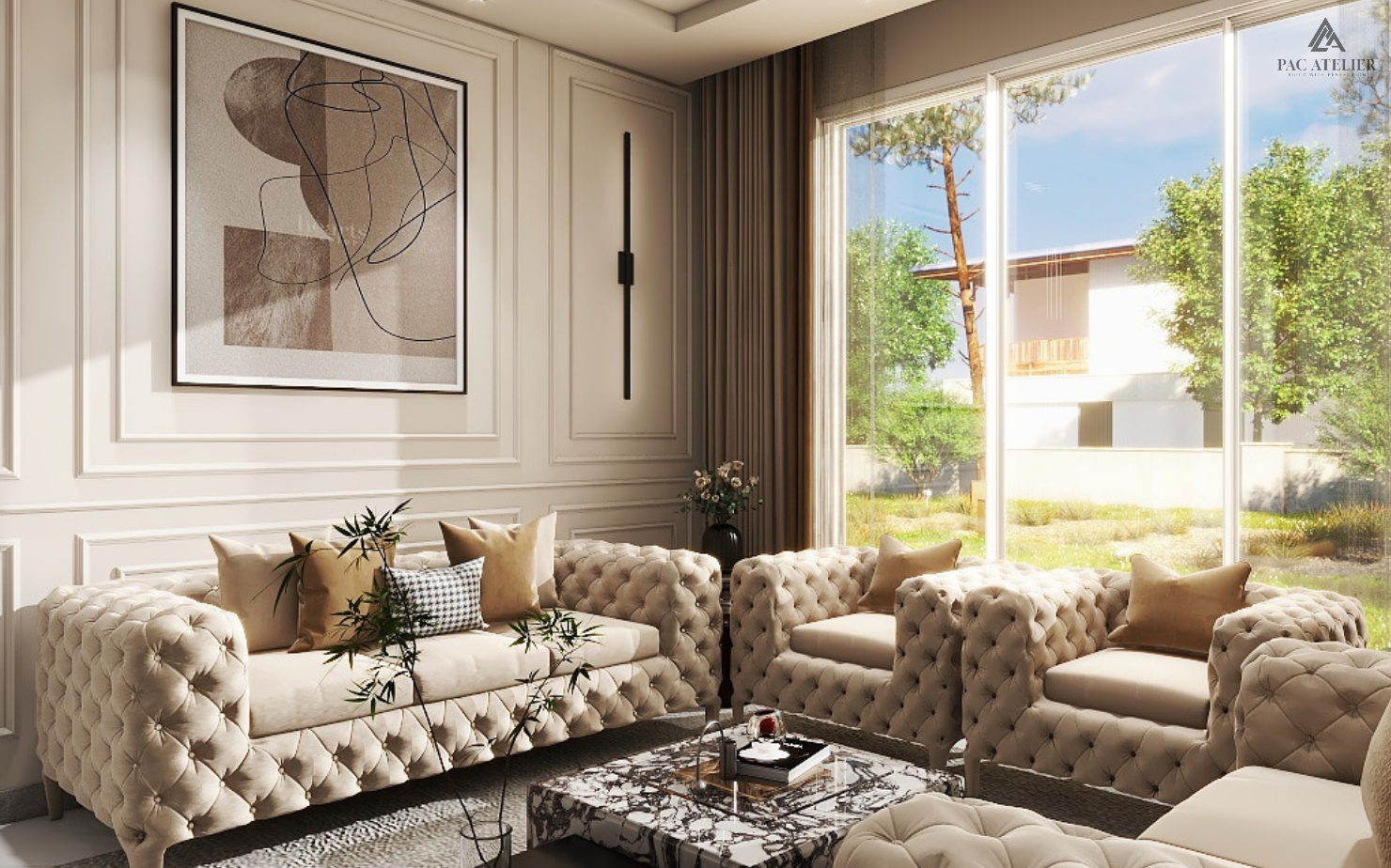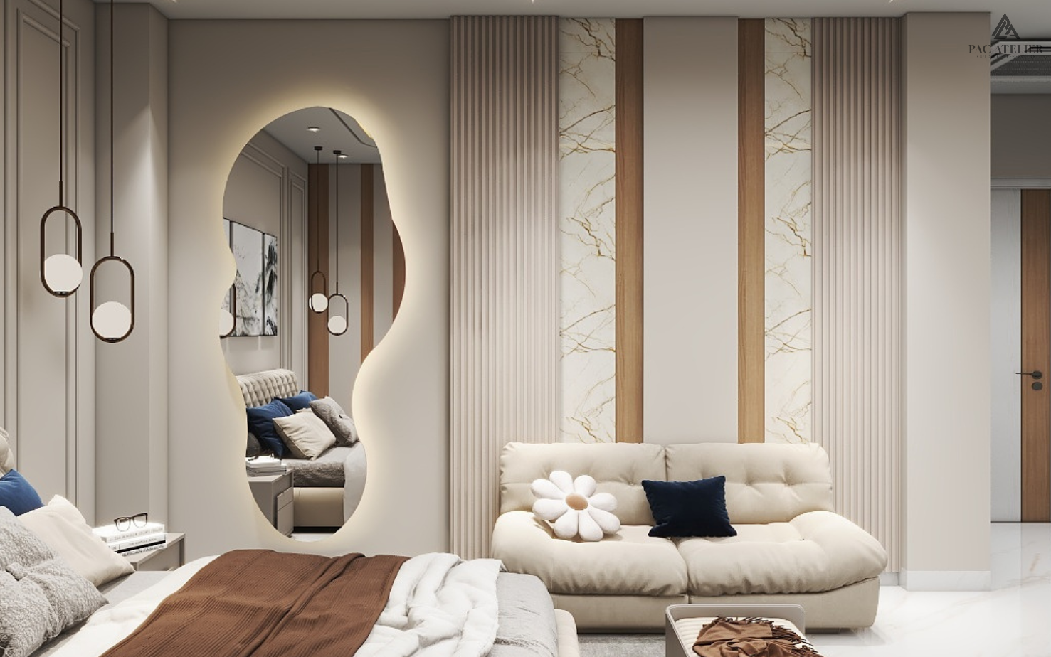The interiors are defined by a calm, neutral palette complemented by graceful wall mouldings and clean, modern lines. Classical architectural elements such as panelled walls and balanced proportions are thoughtfully paired with minimal finishes, creating a space that feels rich, elegant, and effortlessly modern. The living areas are designed as warm, social spaces, featuring plush seating, curated artwork, and soft textures that enhance comfort while maintaining a refined aesthetic. Large windows allow natural light to flow freely, highlighting the subtle detailing and creating a seamless connection between indoors and outdoors. Bedrooms are conceived as serene retreats, combining classical charm with modern functionality. Upholstered headboards, layered lighting, and soft tonal contrasts create an atmosphere of relaxation and quiet luxury. Custom furniture and integrated storage ensure practicality without compromising the visual harmony of the space.