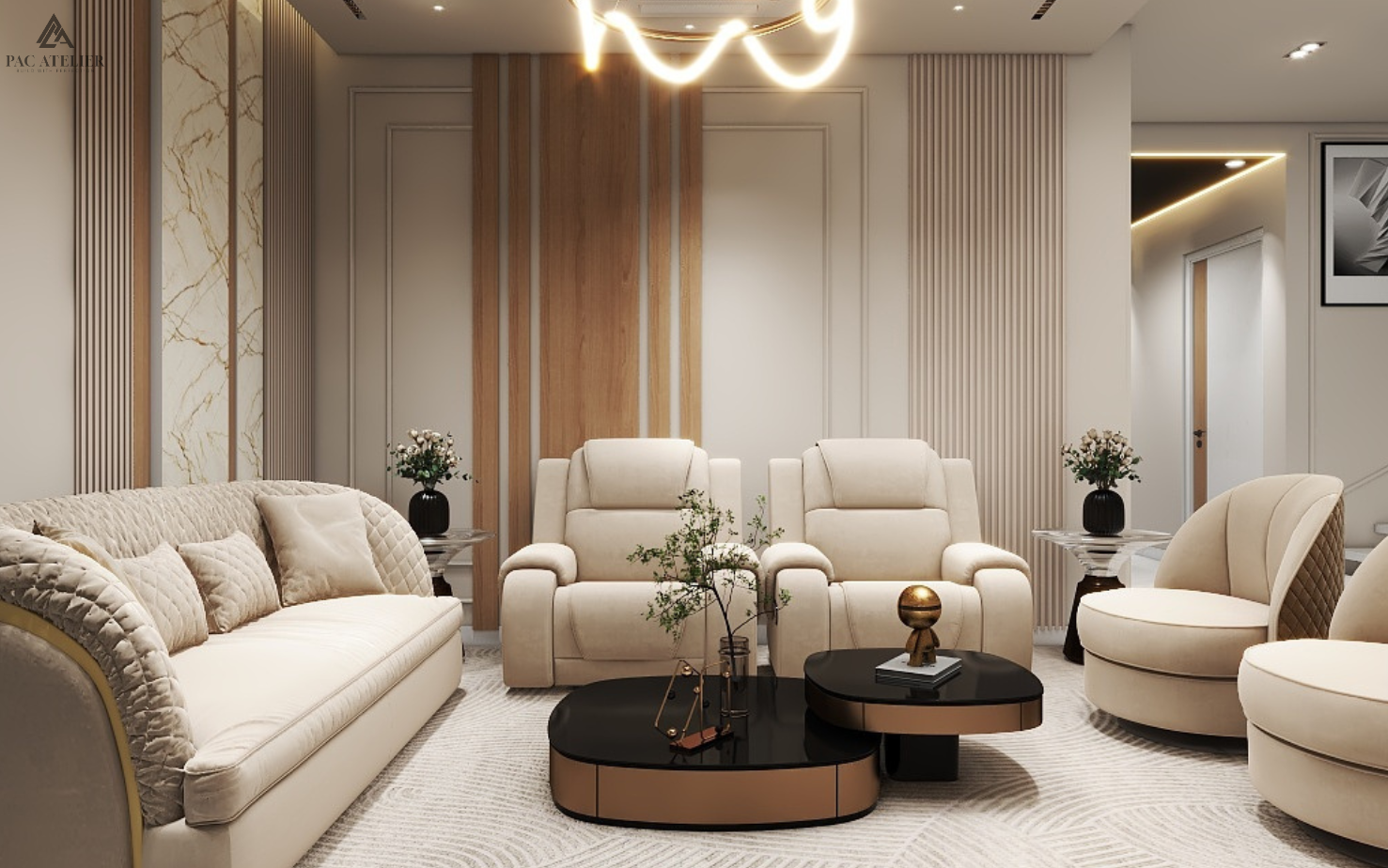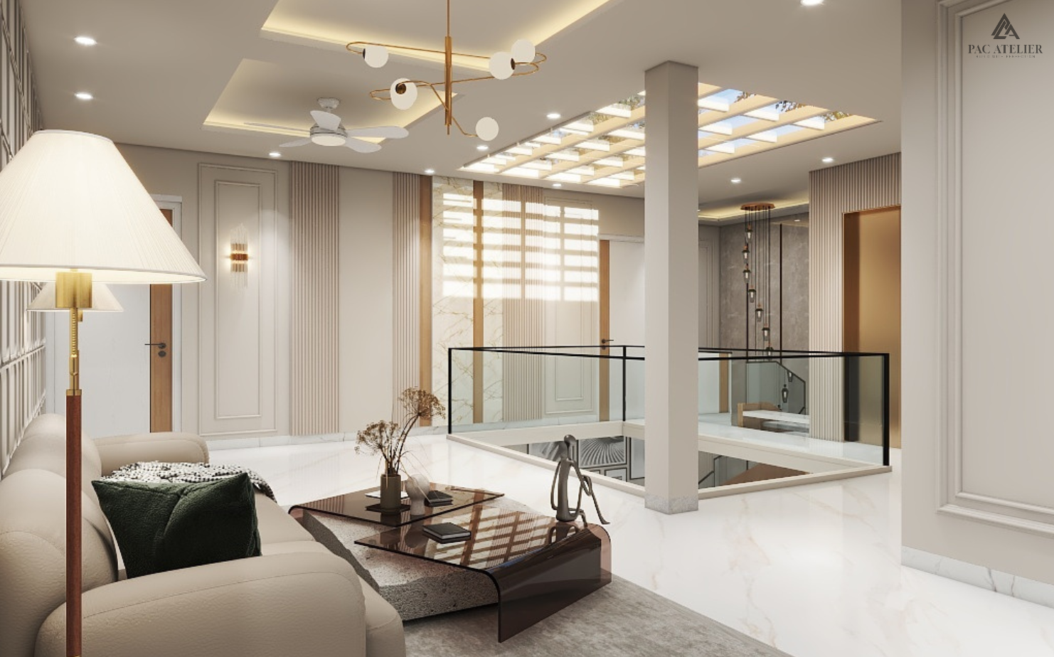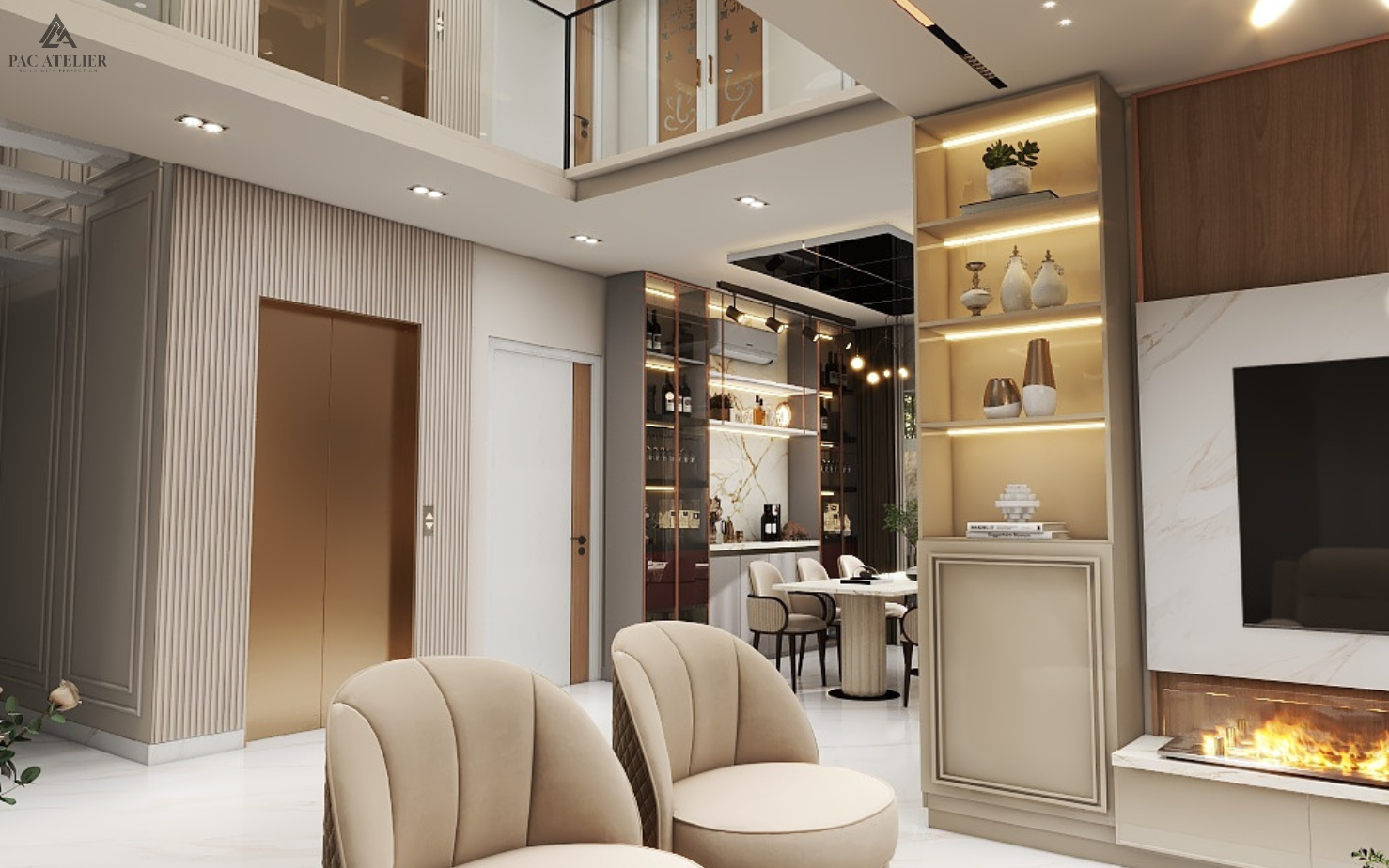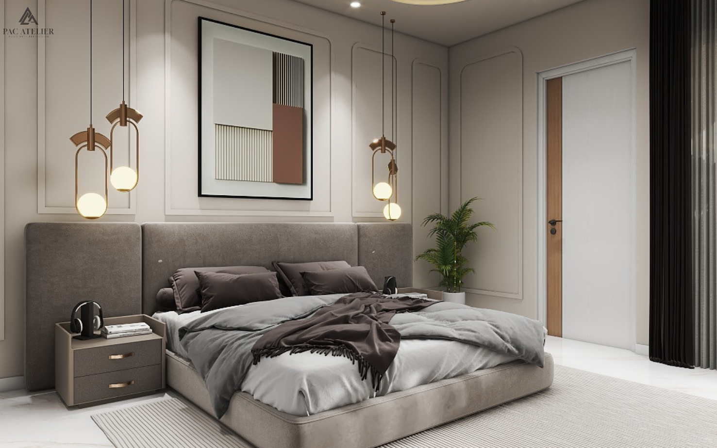 The interiors are defined by a calm, neutral palette complemented by graceful wall mouldings and clean, modern lines. Classical architectural elements such as panelled walls and balanced proportions are thoughtfully paired with minimal finishes, creating a space that feels rich, elegant, and effortlessly modern. The living areas are designed as warm, social spaces, featuring plush seating, curated artwork, and soft textures that enhance comfort while maintaining a refined aesthetic. Large windows allow natural light to flow freely, highlighting the subtle detailing and creating a seamless connection between indoors and outdoors. Bedrooms are conceived as serene retreats, combining classical charm with modern functionality. Upholstered headboards, layered lighting, and soft tonal contrasts create an atmosphere of relaxation and quiet luxury. Custom furniture and integrated storage ensure practicality without compromising the visual harmony of the space.