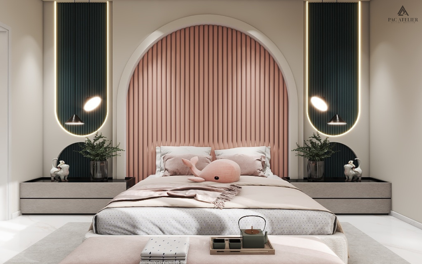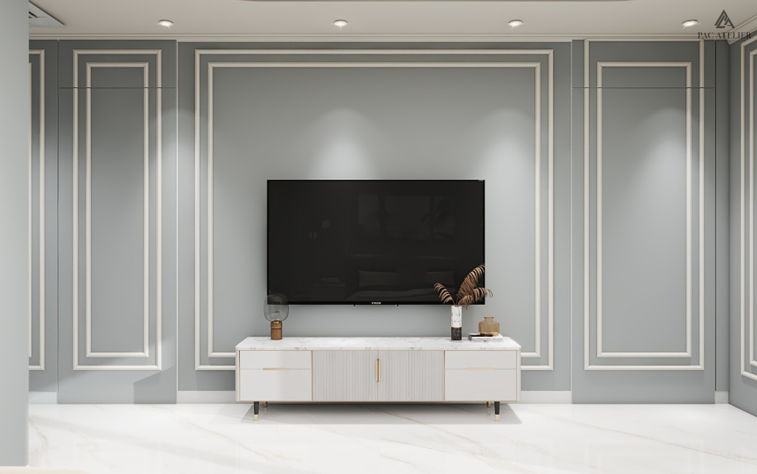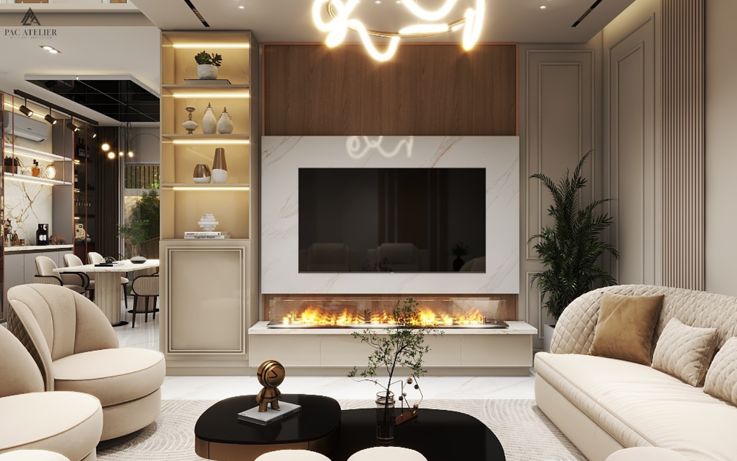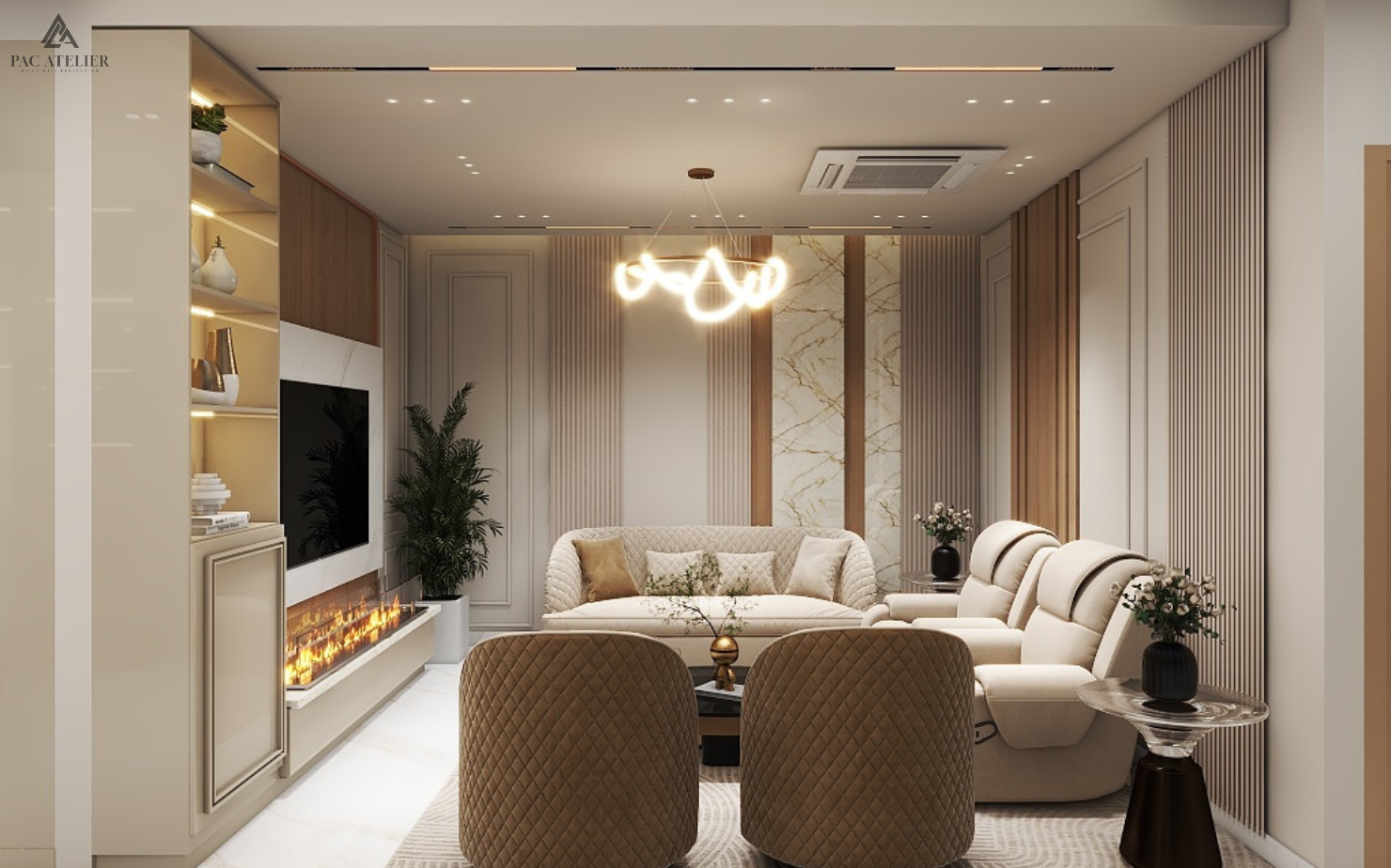 The interiors are defined by a calm, neutral palette complemented by graceful wall mouldings and clean, modern lines. Classical architectural elements such as panelled walls and balanced proportions are thoughtfully paired with minimal finishes, creating a space that feels rich, elegant, and effortlessly modern. The living areas are designed as warm, social spaces, featuring plush seating, curated artwork, and soft textures that enhance comfort while maintaining a refined aesthetic. Large windows allow natural light to flow freely, highlighting the subtle detailing and creating a seamless connection between indoors and outdoors. Bedrooms are conceived as serene retreats, combining classical charm with modern functionality. Upholstered headboards, layered lighting, and soft tonal contrasts create an atmosphere of relaxation and quiet luxury. Custom furniture and integrated storage ensure practicality without compromising the visual harmony of the space.